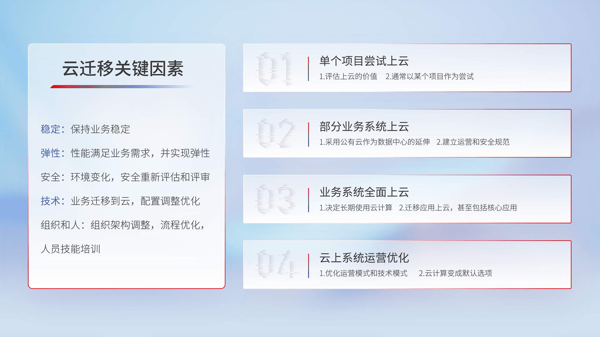 结合实际业务,,从规划设计、、、云平台选型、、云原生改造、、、、数据迁移、、、集成交付,,迁移全过程为客户识别最佳上云路径,,,做好风险识别管理,,设计网络架构、、、、身份权限、、、安全审计合规、、、操作审计、、日志审计、、监控告警策略、、多站点容灾设计等,,对云上基础设施进行整体规划,,,,提升IT治理水平,,,,以满足弹性、、、、高可用、、、、高性能的需求。。