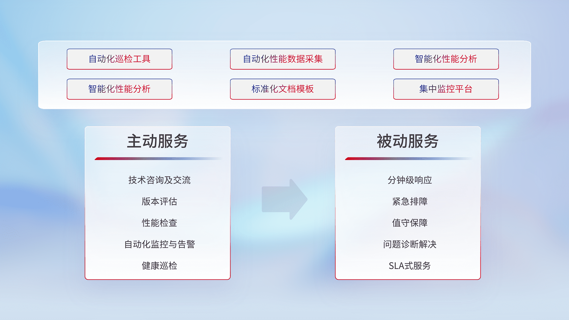 智能化工具和标准化文档,,,,保障服务质量,,提供主动服务(包含技术咨询、、版本评估、、、、性能检查、、自动化监控与告警、、、、健康巡检)和被动服务包含(分钟级响应、、、、紧急排障、、、值守保障、、、问题诊断解决、、、、SLA服务)。。。