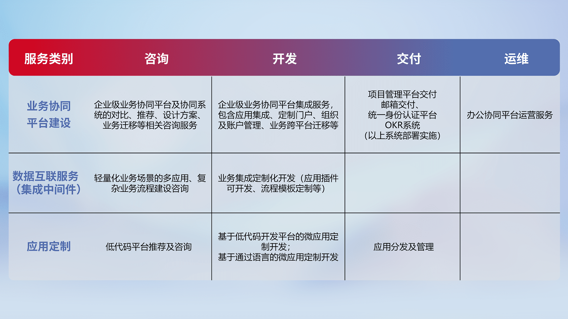 针对钉钉、、、、企微、、、IDaas等平台级产品提供产品的规划、、、、方案、、交付、、、定制化开发等服务,,,实现如统一协同办公、、智能客户服务、、、混合会议管理、、智能数据查询、、、等业务场景,,实现数字化转型。。。